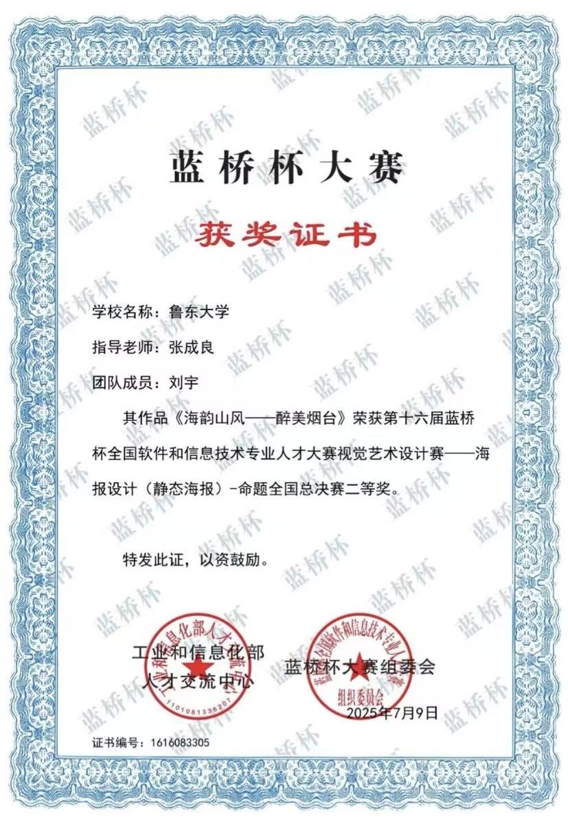 近日,由新闻与传播学院张成良教授指导、2024级研究生刘宇同学创作的《海韵山风——醉美烟台》,凭借鲜明的地域特色与精湛的设计水准,成功斩获蓝桥杯全国软件和信息技术专业人才大赛视觉艺术设计赛国家级海报设计类二等奖。