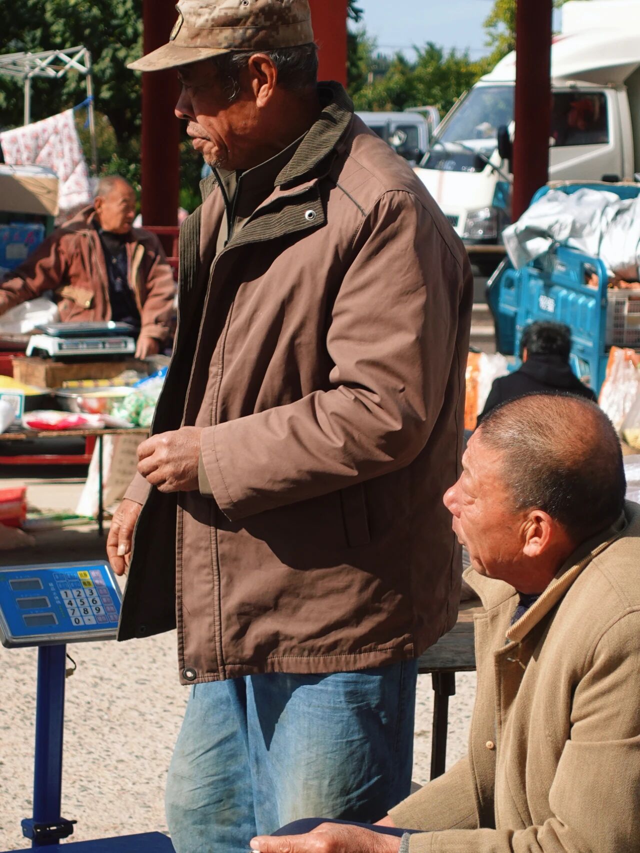 集市上传来菜香和吆喝,他站在摊边,身后的秤盘还压着刚称好的菜,蓝筐子堆着新摘的蔬果。这热闹的阵仗,是寻常日子里的凑堆儿,大家买不买的先扯两句,打探打探菜价,话里藏着半村的家长里短。阳光落下来,沾着这市井里的踏实。
