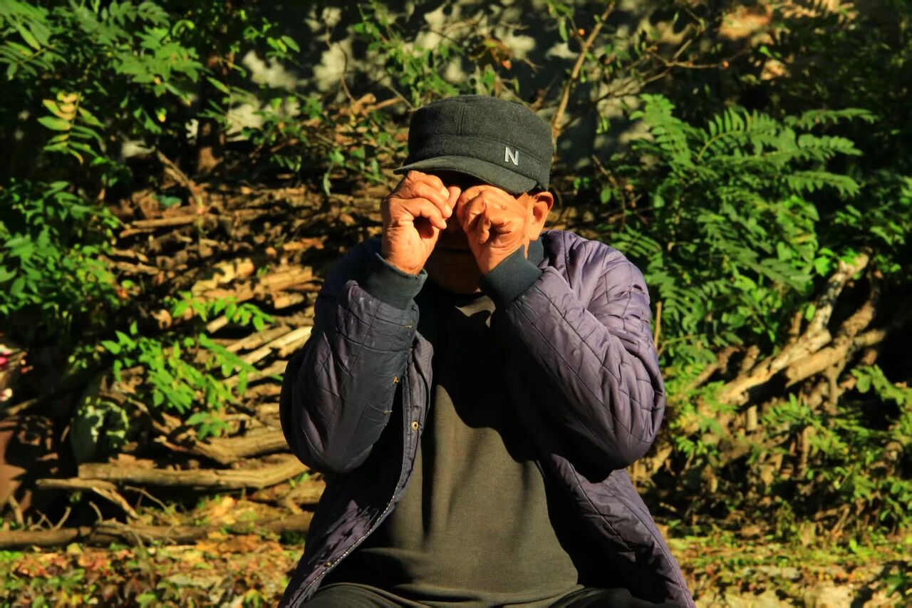 这手一抬,像把太阳当成了晃眼的玻璃弹珠。爷爷蜷着指节挡光的样子,像极了小时候蹲在晒谷场,被晃得眯眼时,慌里慌张捂眼睛的模样。身后那堆柴火也像在跟他玩躲猫猫,日子过得朴实又不失童趣。