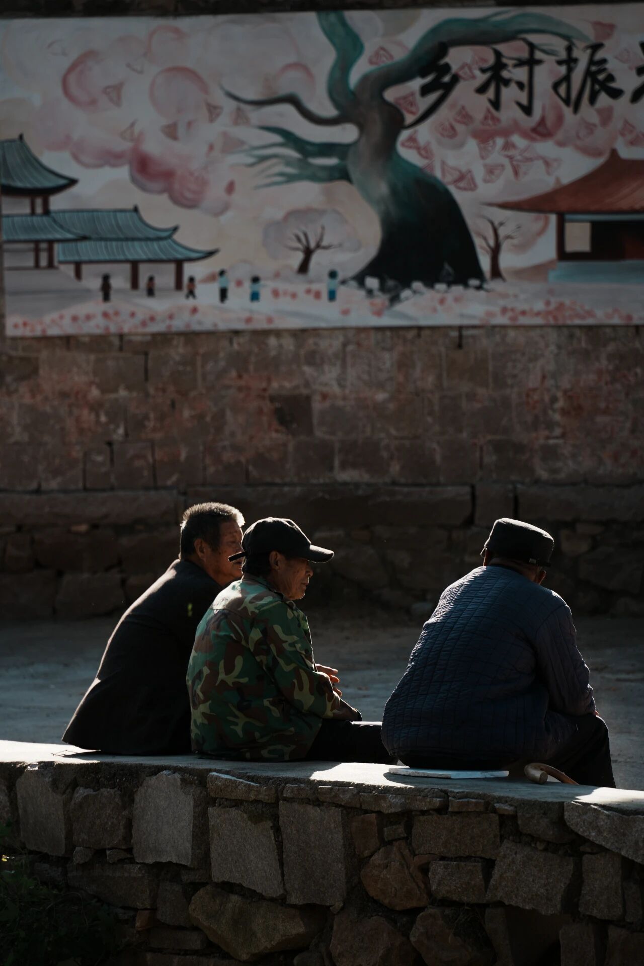 阳光打在石墙上,背光而坐的仨人往石台上一坐,影子都显得松快。爷爷们刚干完农活,歇息片刻时的话不必多,坐在粗粝的石台上晒着太阳闲扯两句,感叹天气晴朗之迹,日子便从这一言一句中不慌不忙的过去。他们坐的不只是台子,还是生活了大半辈子的熟稔,连沉默中都带着老辈子才懂的松弛。
