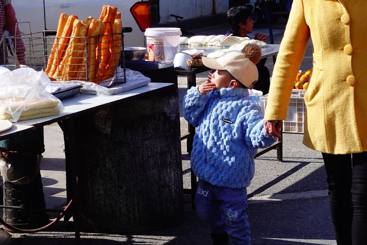 油条的香气热乎乎地往鼻尖钻,小家伙攥着大人的手,圆绒帽上的毛球跟着脚步晃,蓝毛衣蓬得像颗棉花糖。他偷偷把指尖往嘴边送,像是吃到了什么美味的点心,这集市的热闹里,最甜的就是他偷尝一口的细碎欢喜。他幼小的脑袋里,此刻不知藏着多少奇思妙想。