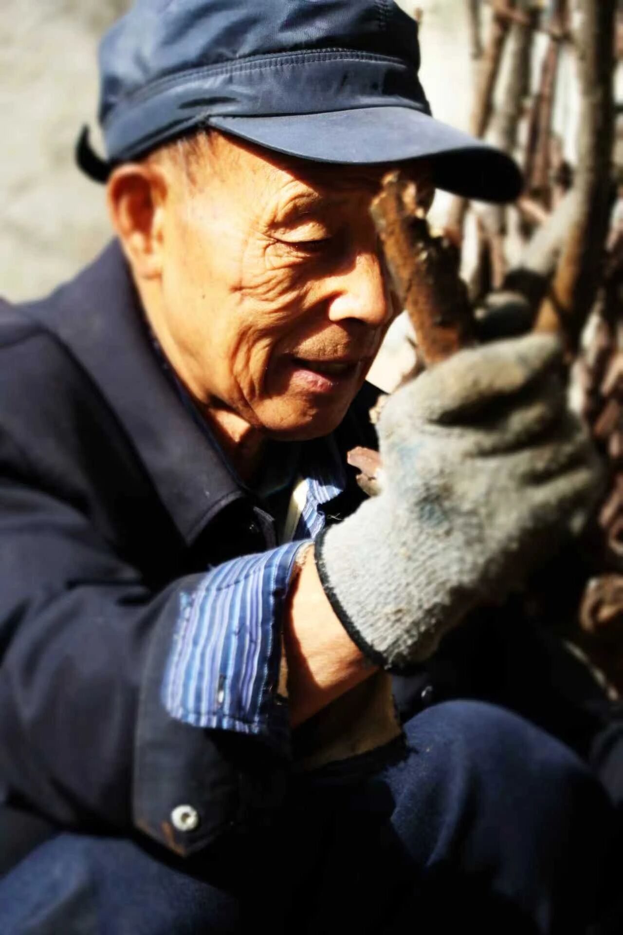手套上沾着些柴屑,他把手里的枯枝凑得近,眼尾的纹皱里写满了细致。指尖碰上去的力道,带着日子里攒下的妥帖。阳光落在他侧脸,这双手攥过农具、拾过柴禾,把山野里的细碎,都揉成了生活的点点滴滴。