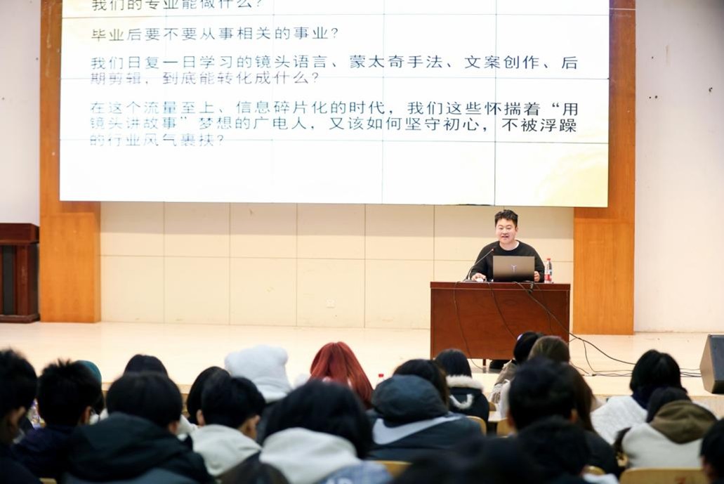 讲座伊始,2009级广播电视编导专业校友、东方卫视导演高强以“从校园梦想到荧屏现实”为主线,分享了他的传媒旅程。从创建DV社团的青春热血到大一文学课的深厚积淀,从首拍作品的忐忑到考研深造的抉择,他将个人成长娓娓道来。以上海大学求学经历为转折点,他完成了从影像爱好者到专业创作人的蜕变,更以《梦想改造家》的导演经历为例,深入阐释了"人文关怀是节目灵魂"的创作理念,鼓励学子保持对世界的敏锐感知,让热爱在专业土壤中生根发芽。